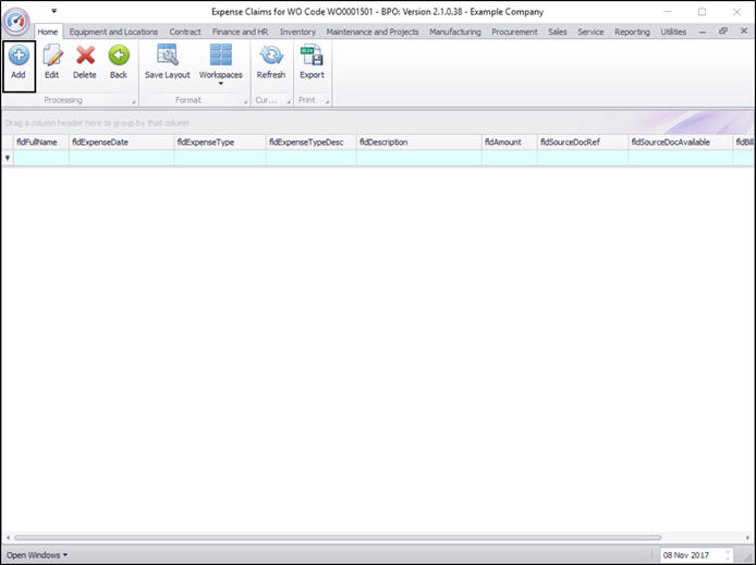 - You will return to the Expense Claims for WO Code [ ] listing screen where you can now view the added expense claim.