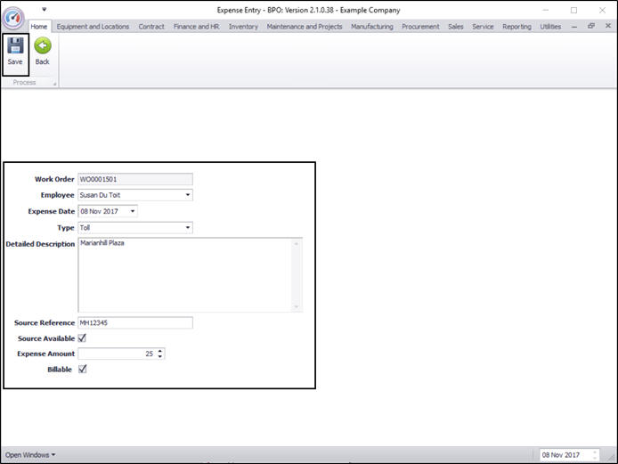 The Expense Entry screen will be displayed.
