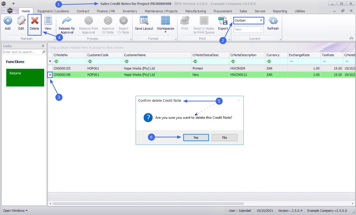 - When you receive the Confirm delete Credit Note message;