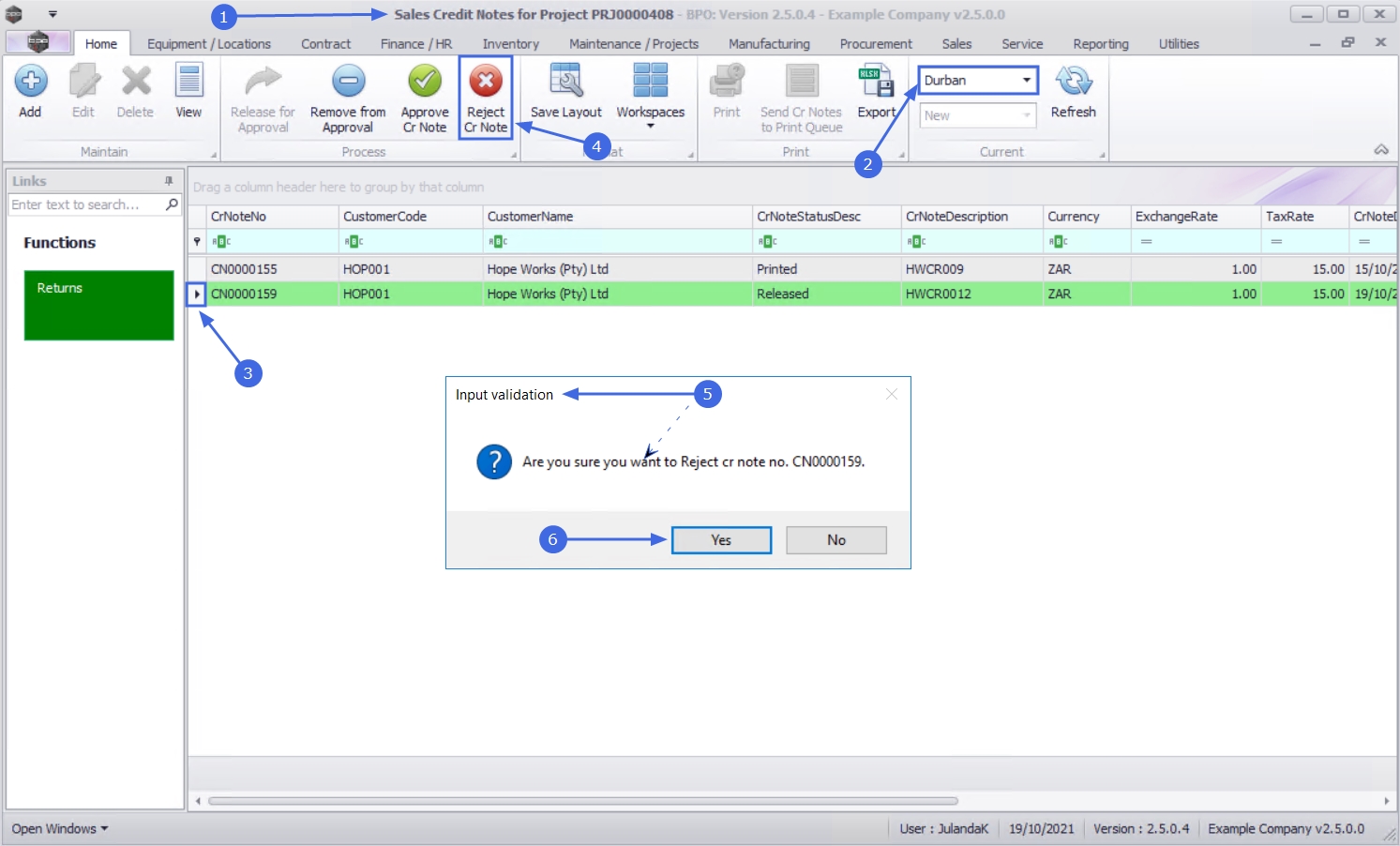 - Are you sure you want to Reject cr note no. [credit note number].