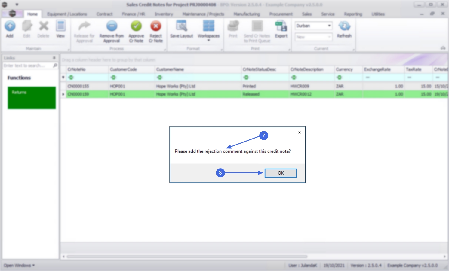 - Select the row of the Credit Note you wish to reject.
