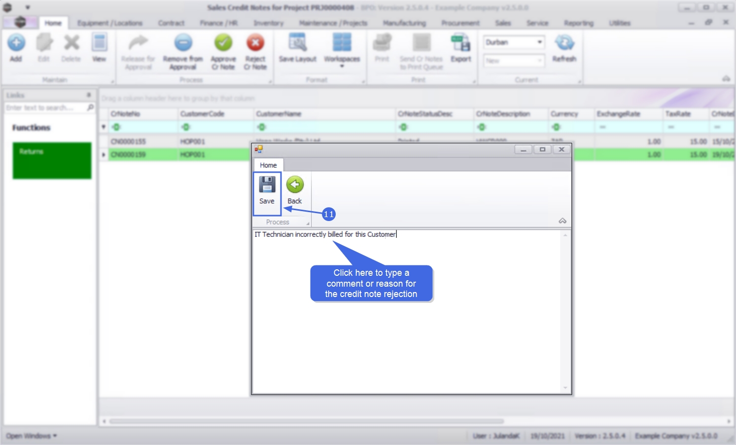 - Click in the text area to type a comment or reason for the Credit Note rejection.