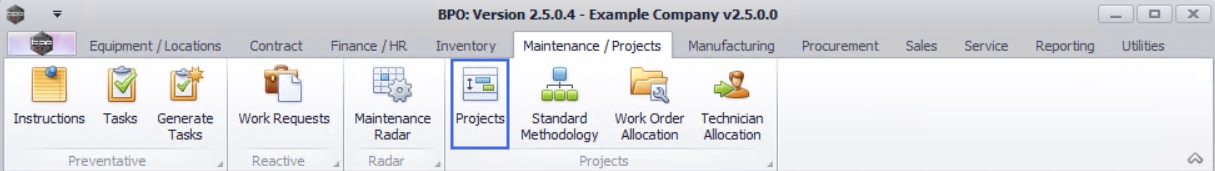 | Ribbon Access: Maintenance / Projects > Projects |
