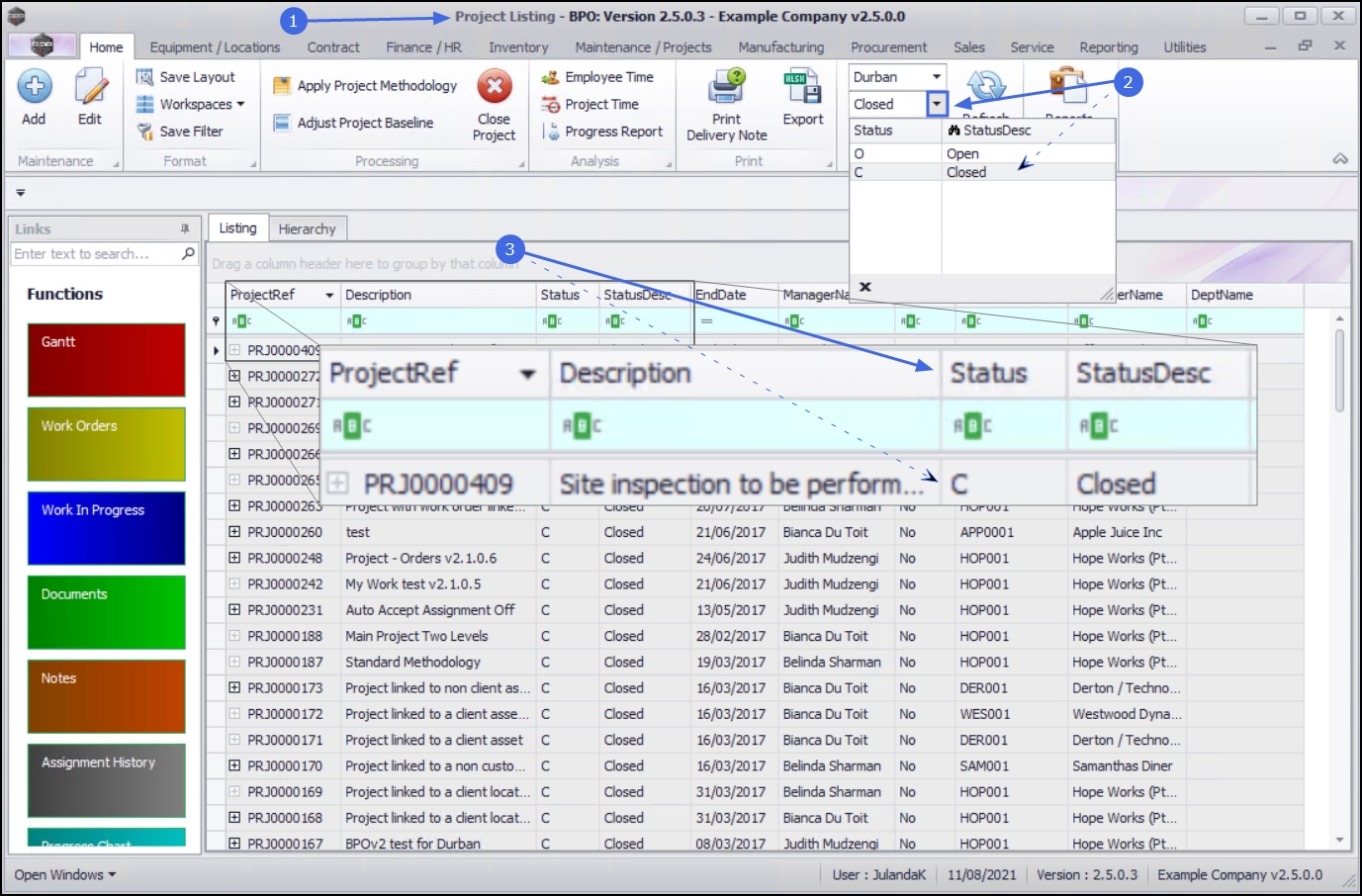 - Note the project in the project list with the Status changed to C - Closed.