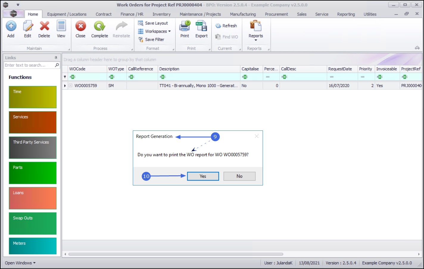 The Work Order Report can be printed from the Work Orders for Project and from the Maintain Work Order screen. For the purpose of this manual, the report will be generated from the Work Order for Project screen.