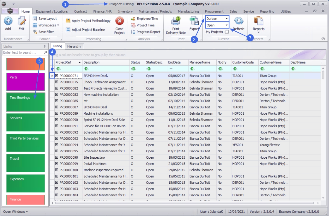 The Time Bookings for Project : [project ref number] screen will be displayed.