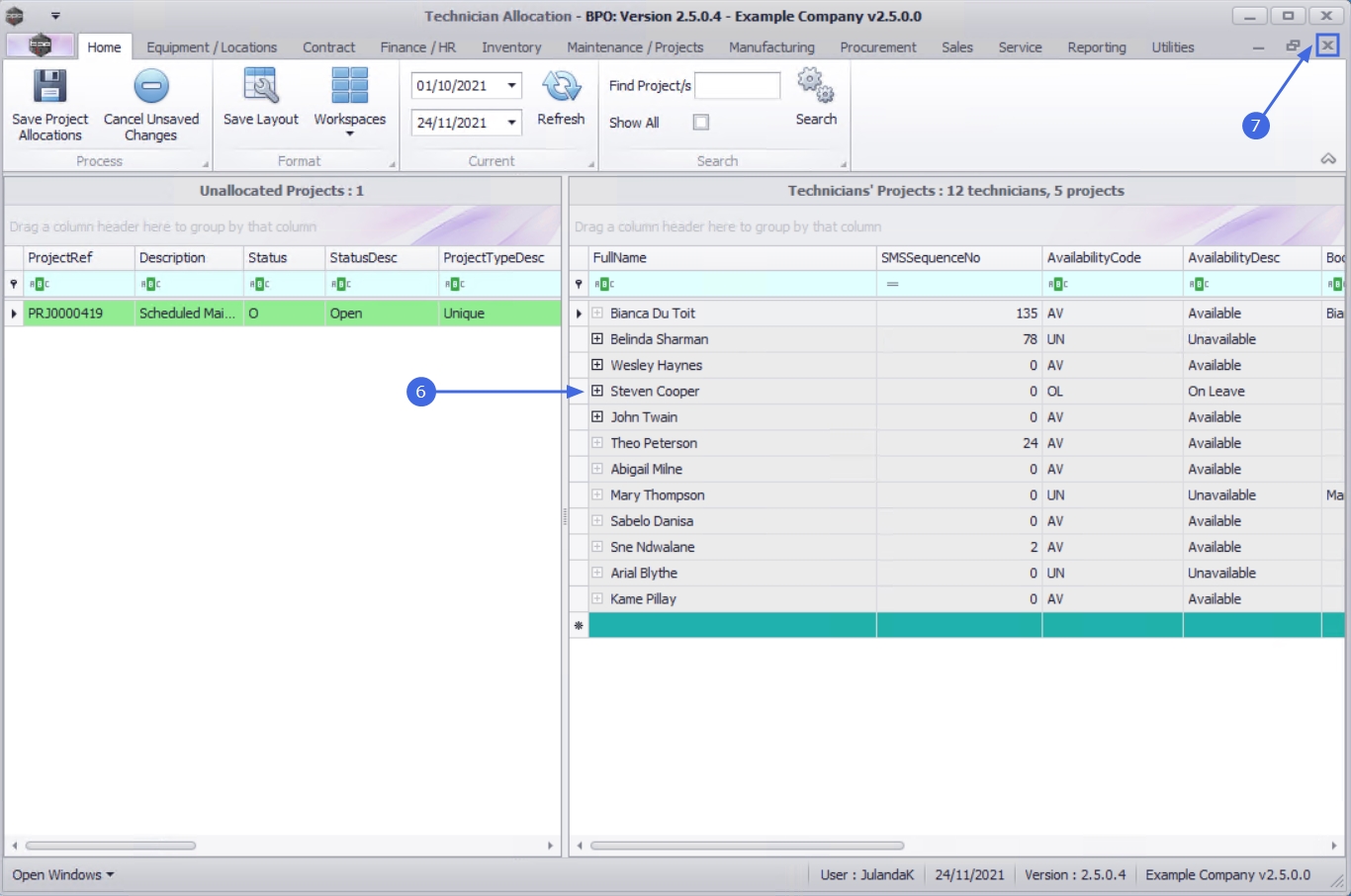 | Ribbon Access: Maintenance / Projects > Technician Allocation |