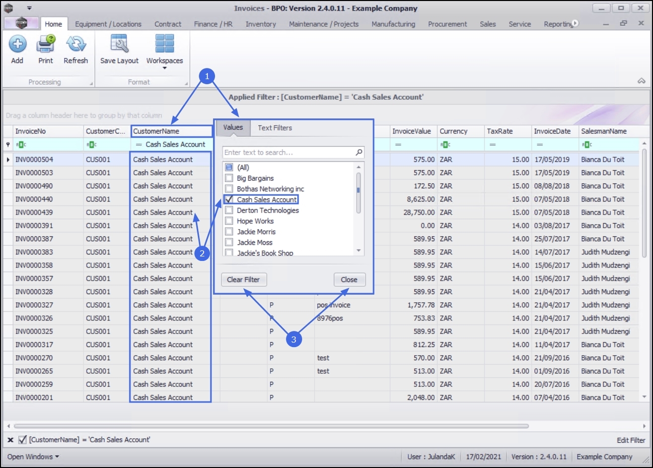 - Click on the filter in the Customer Name field to display the Filter option screen.