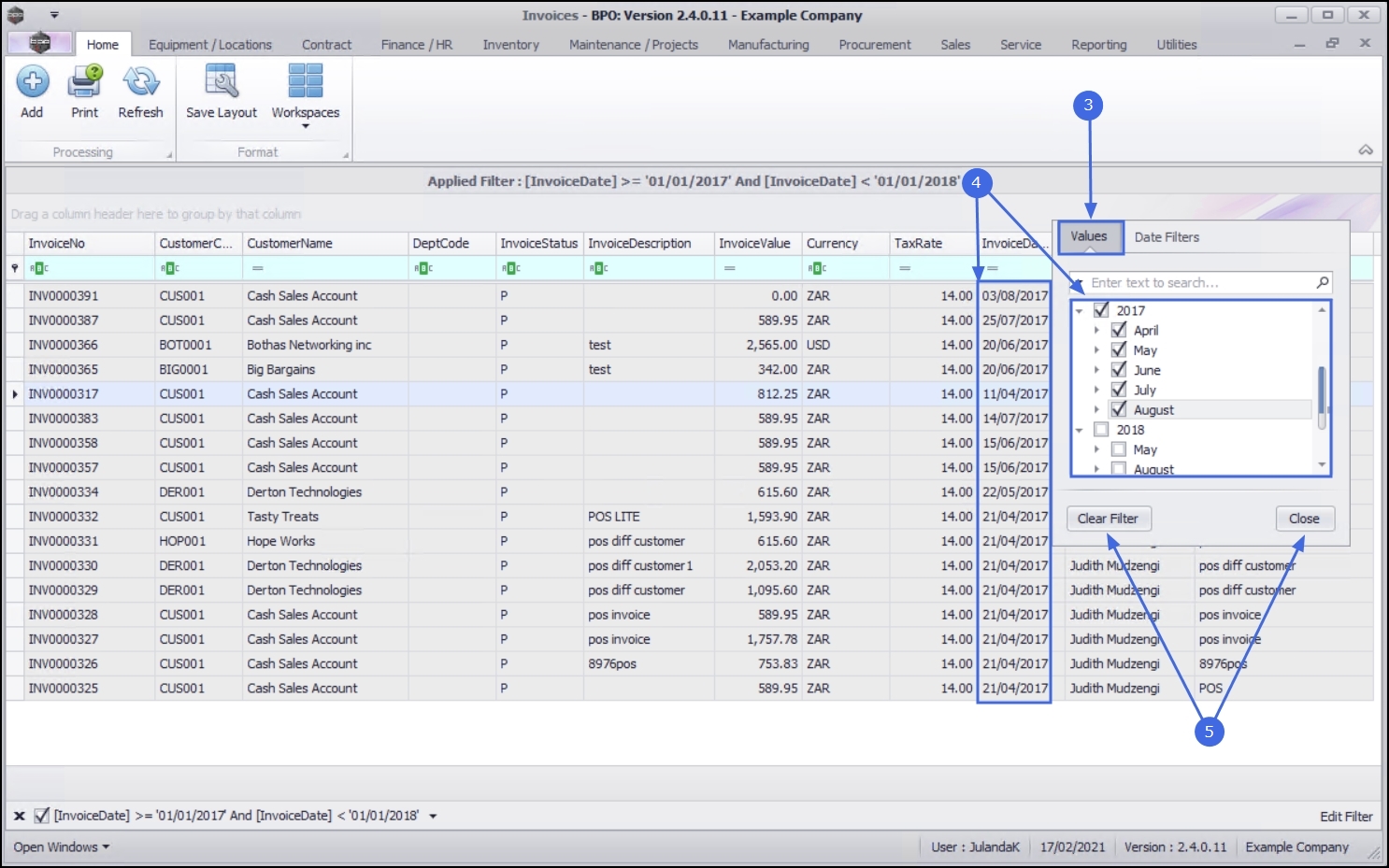 - Click on the filter in the Invoice Date field to display the Filter option screen.