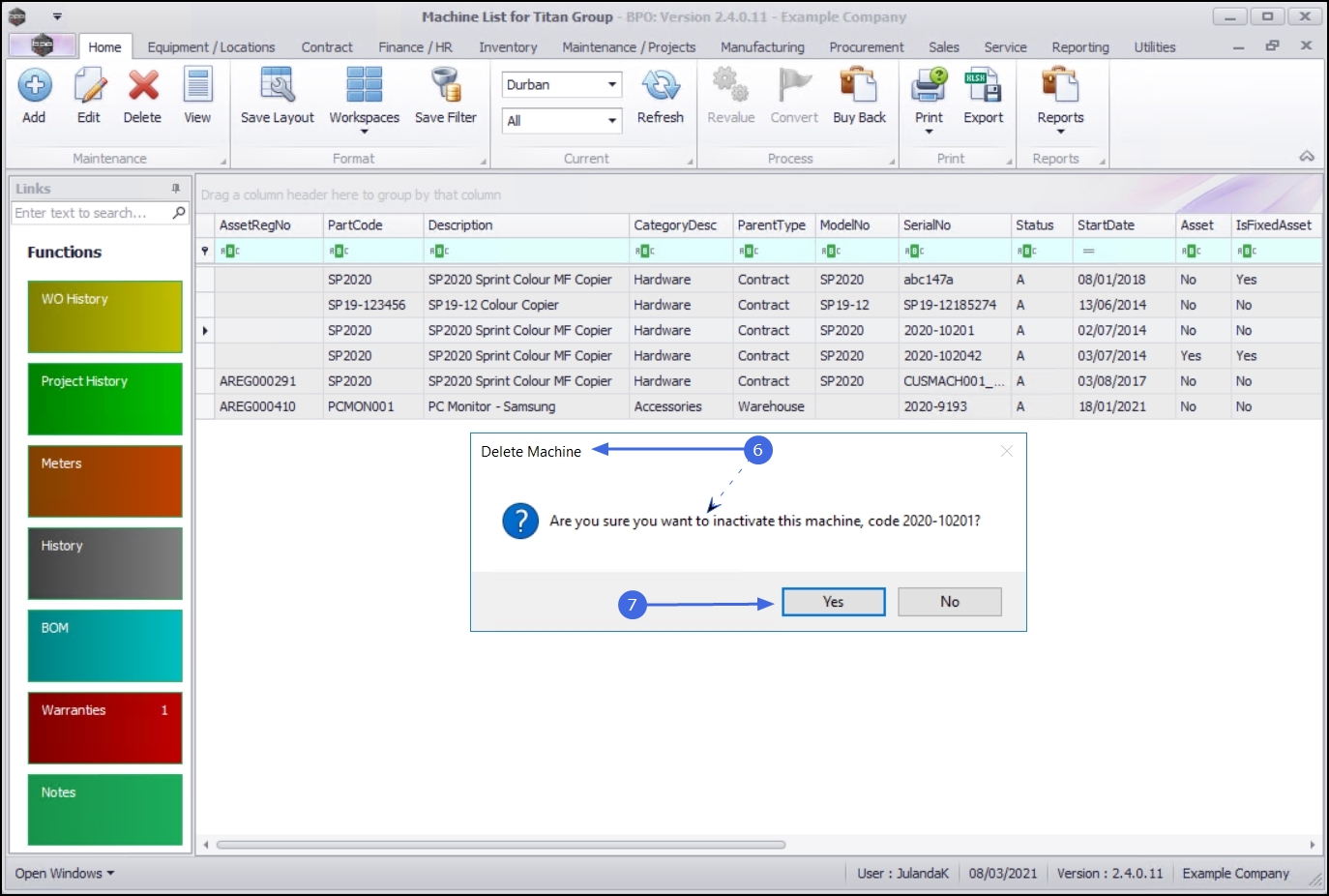 - Are you sure you want to inactivate this machine, code [serial number]?