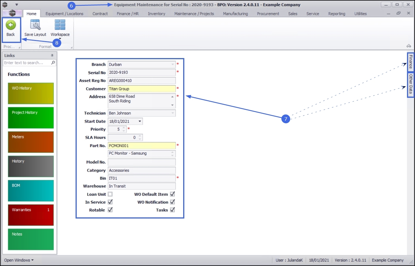 - You can only view the Equipment details, Finance details or Other Data details, no changes can be made here.