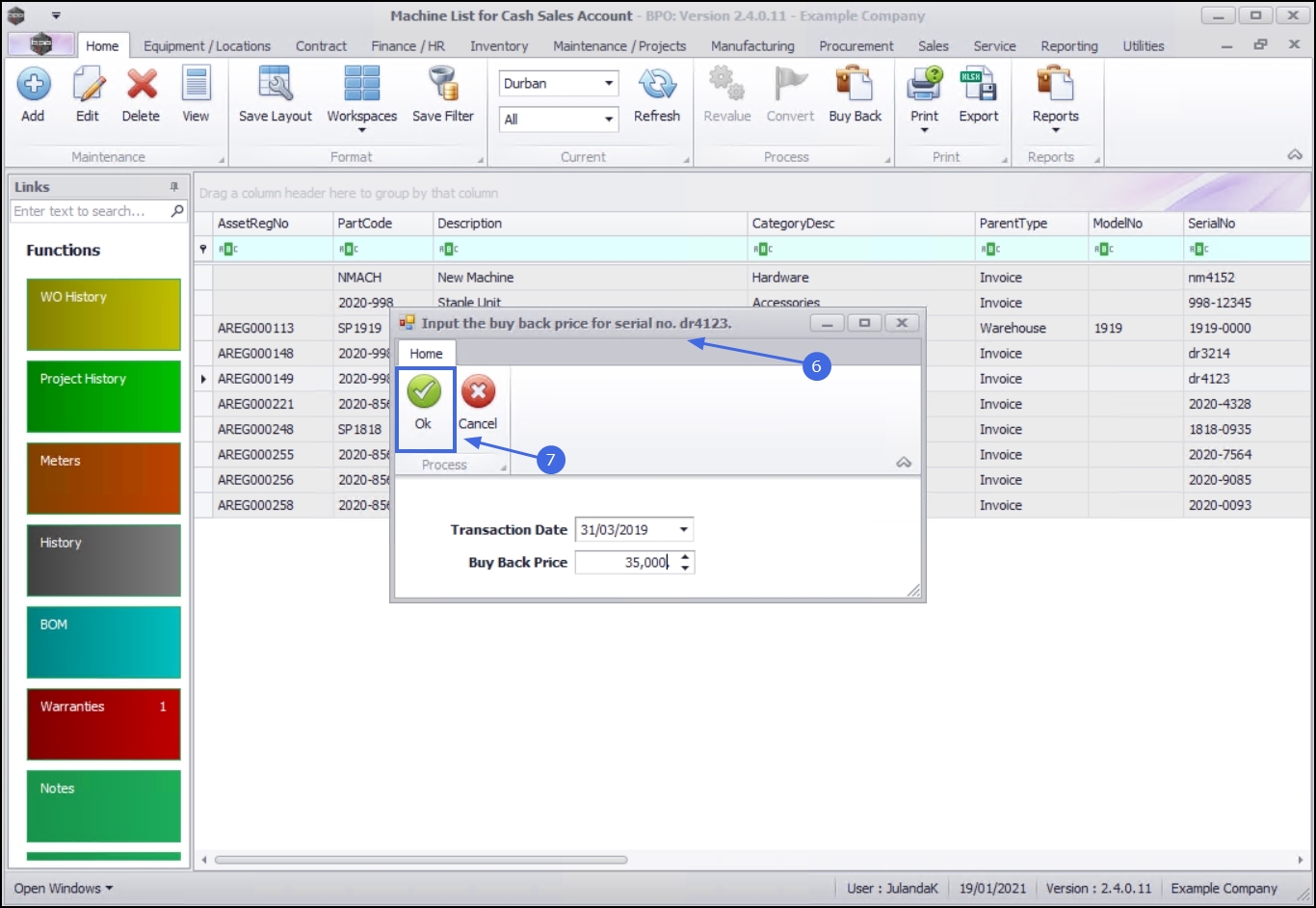 - Select the row of the Customer Asset / equipment item that you wish to buy back.