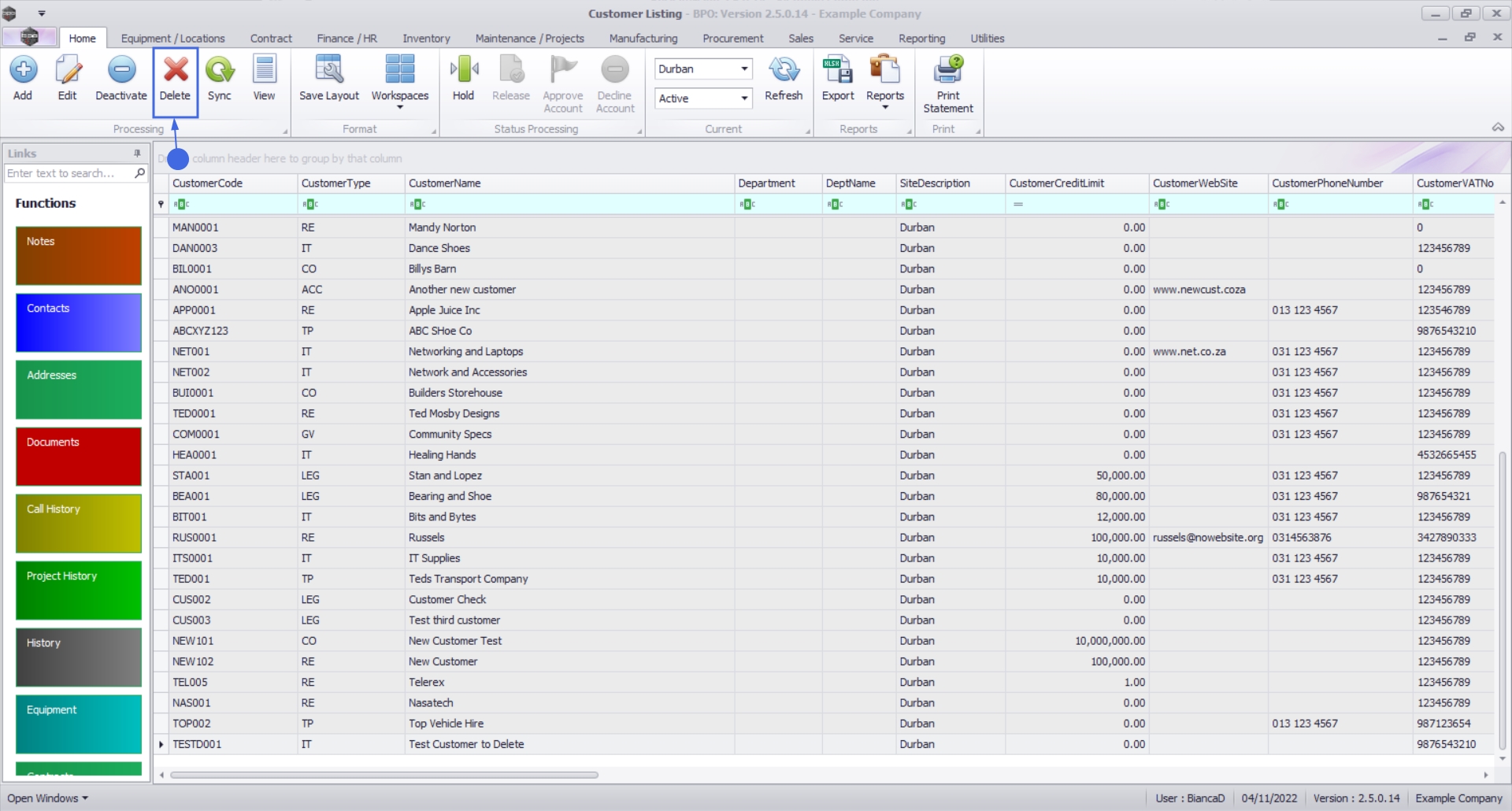 Deleting a Customer will change the status for the Customer to (X) Deleted. If BPO is integrated with Evolution, the customer will show as Deleted in BPO.