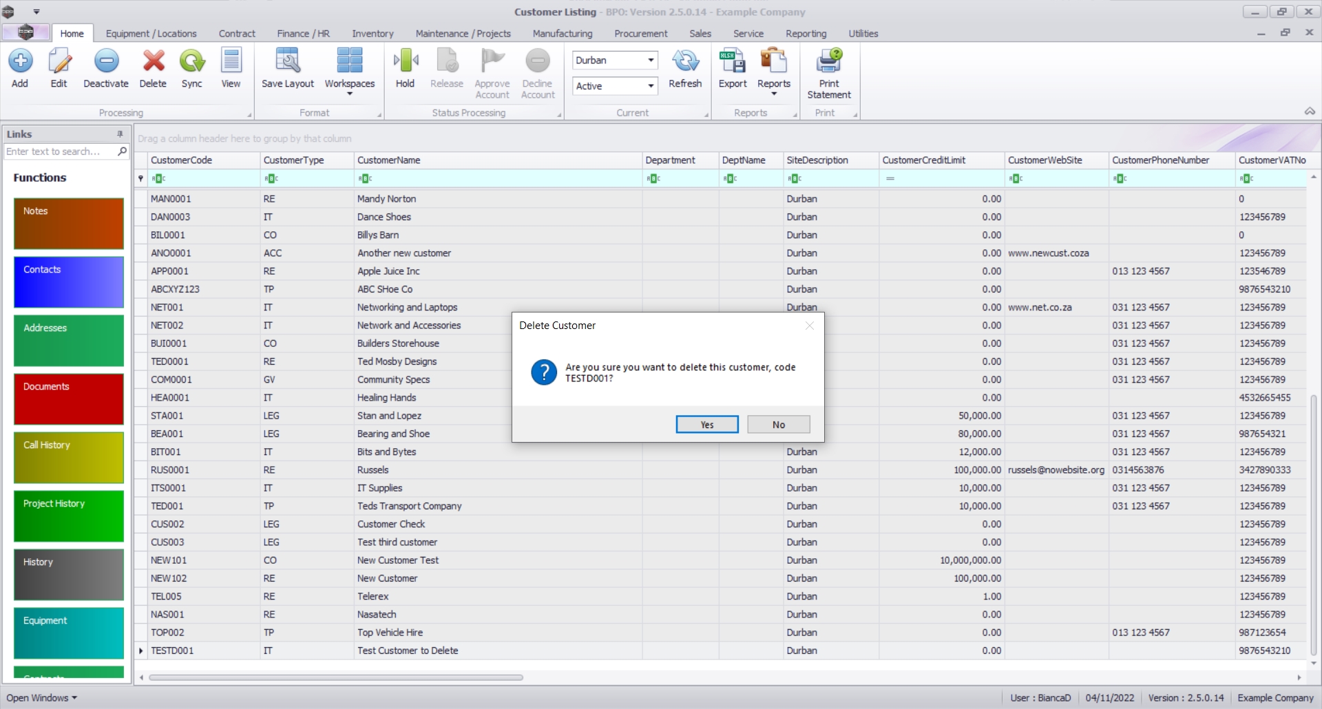 A message box will come up, asking: Are you sure you want to delete this customer, code [customer code]?