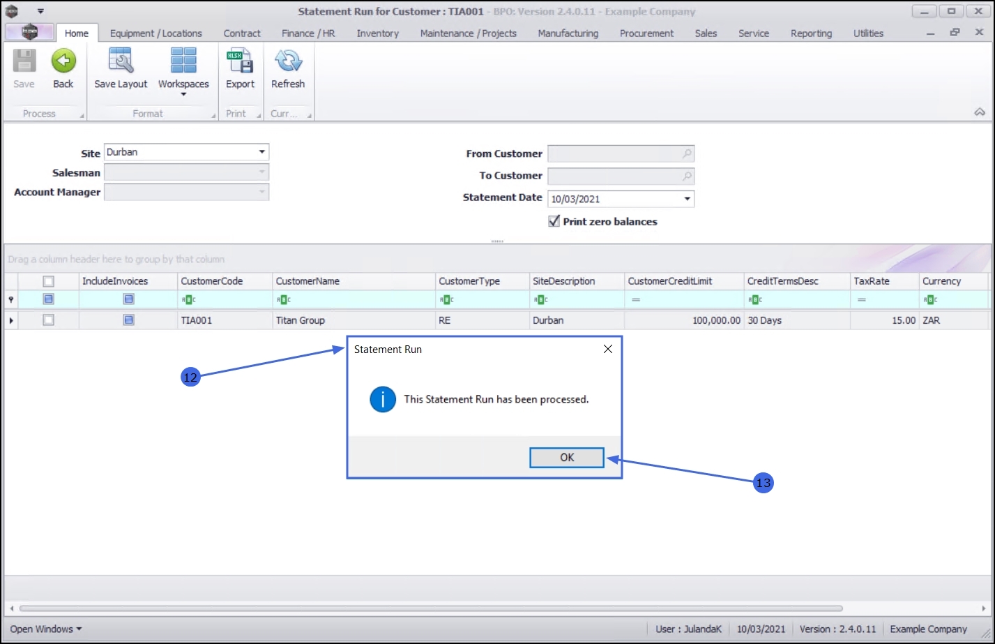 - The Statement Run for Customer : [customer code] screen will be displayed.
