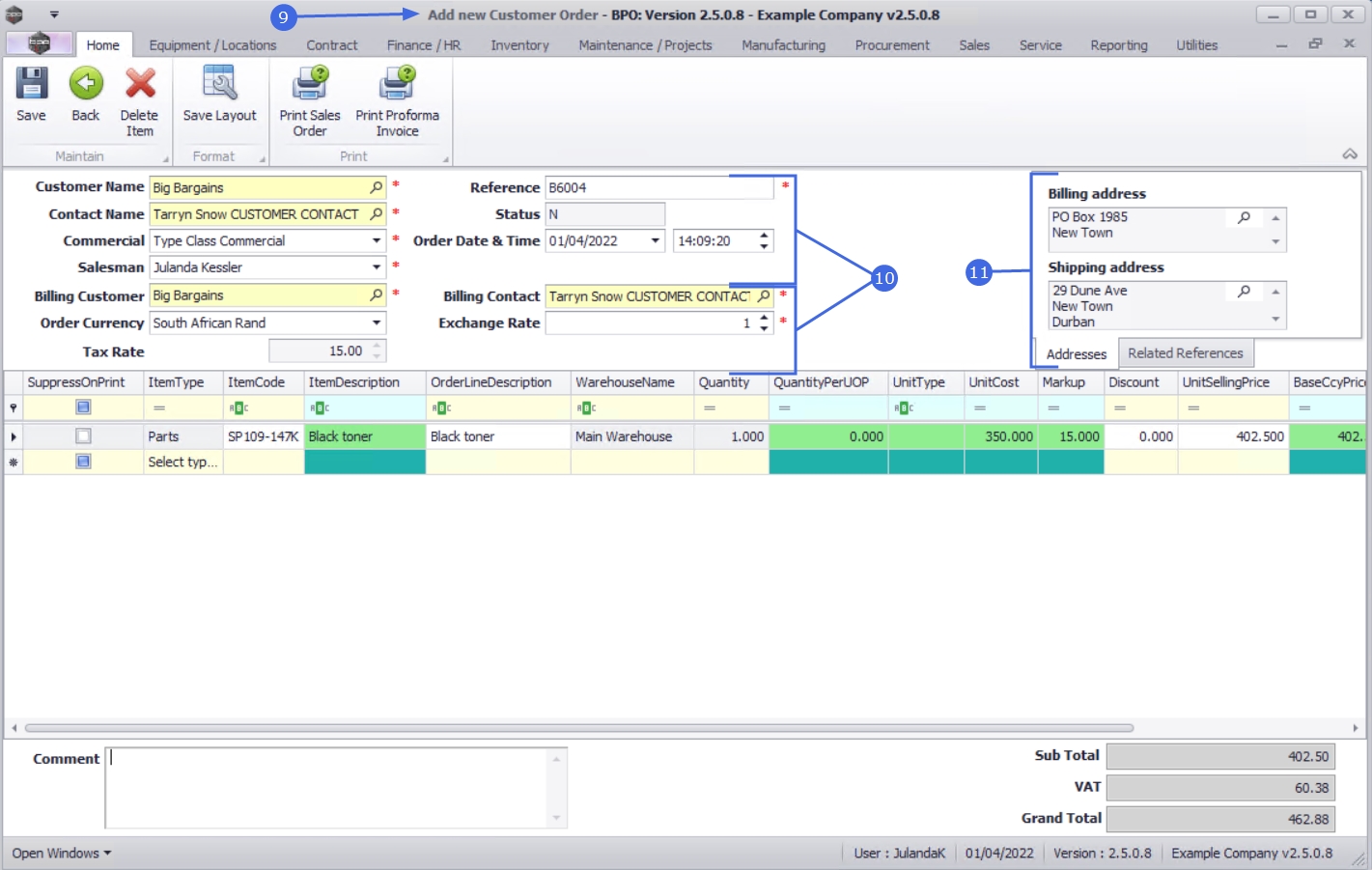 4. Click on Save to save the changes to the Customer Order and return to the Sales Orders for Customer screen.