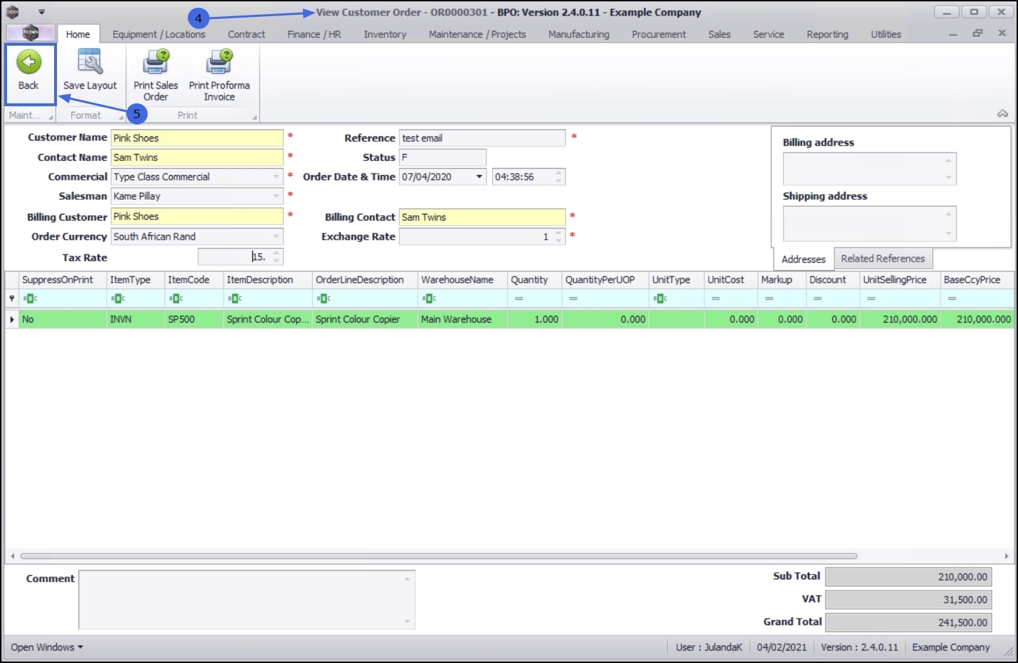 2. Click on Back to return to the Sales Orders for Customer screen, or