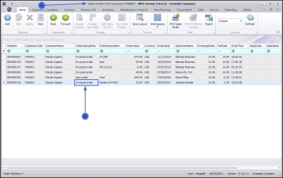• The Forward navigation button, is only available in the '[I] - Invoiced' Order Status. This allows for quick navigation to the related documentation by navigating to view the Sales Customer Invoice that has been created from the selected Sales Order.