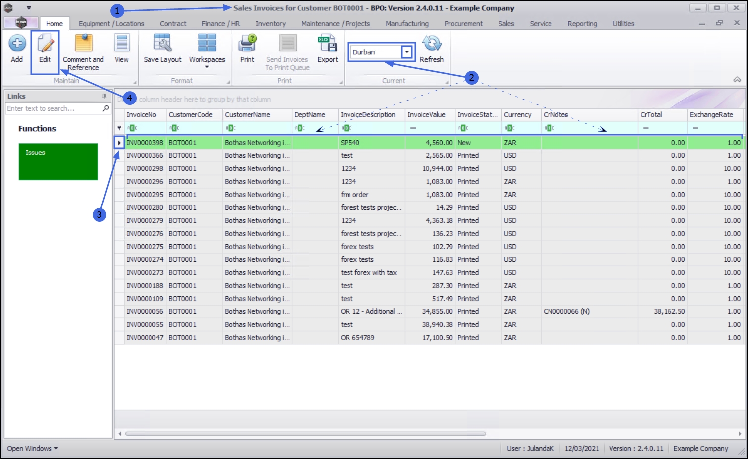 - Select the row of the Invoice you wish to edit.