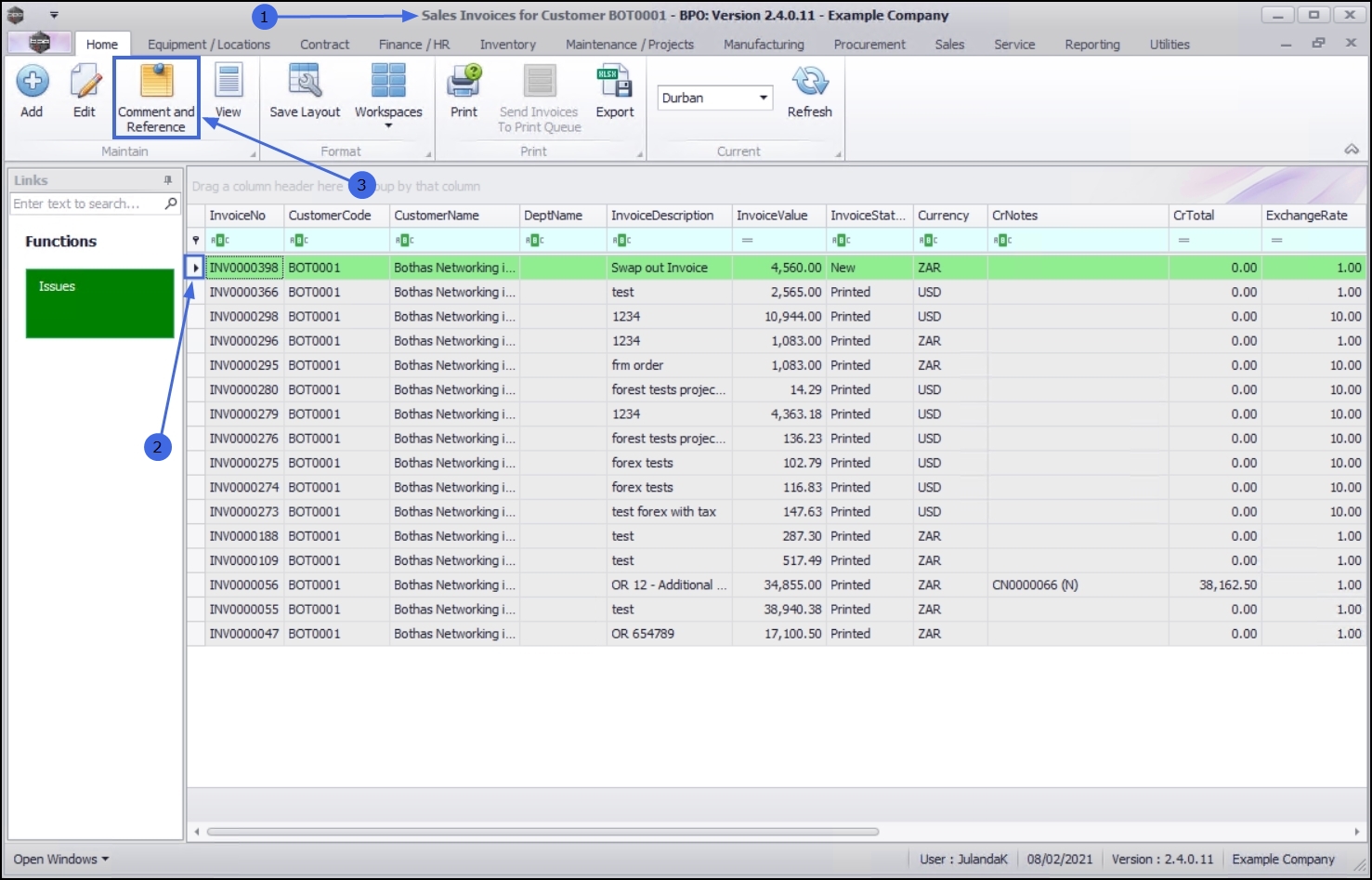 - Select the row of the Invoice you wish to add or view the Comment and Reference information for.