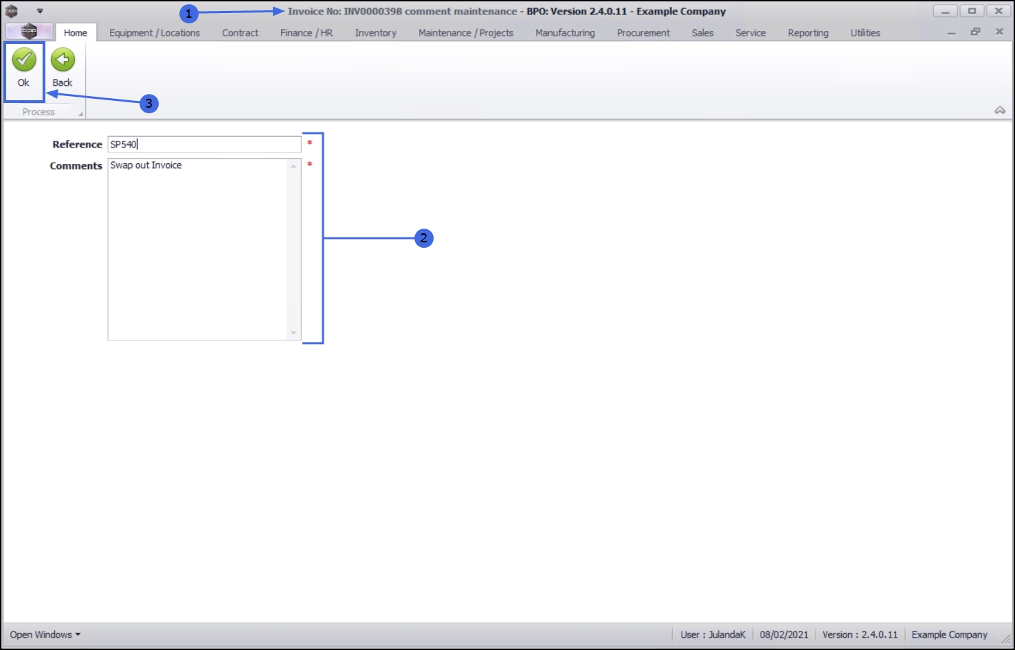 - Note the Comment and Reference Number fields have been updated with the changes made, using the Comment and Reference button.