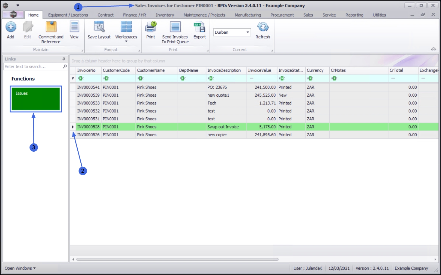 - Click on the row of the Invoice you wish to view the linked issued items.