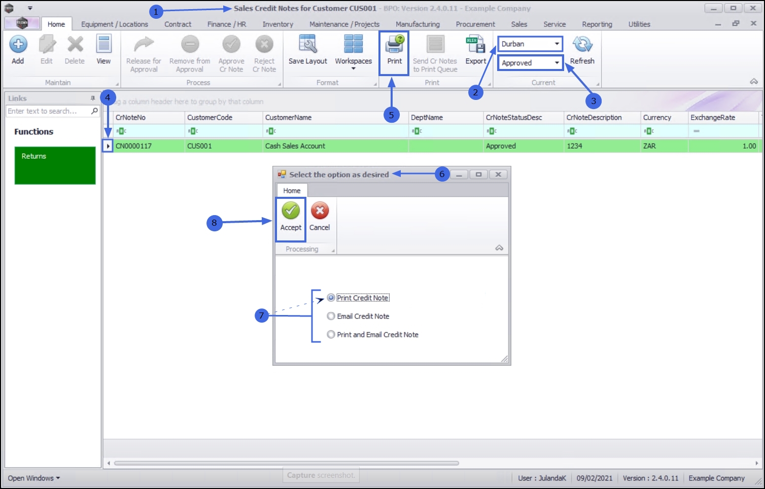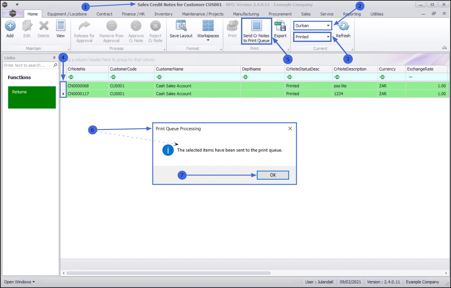 - Click on Send Cr Notes to Print Queue.