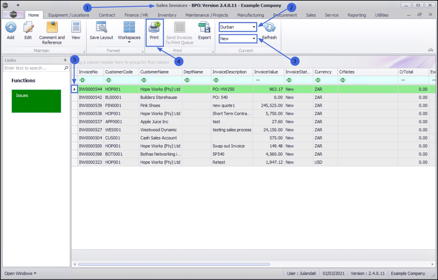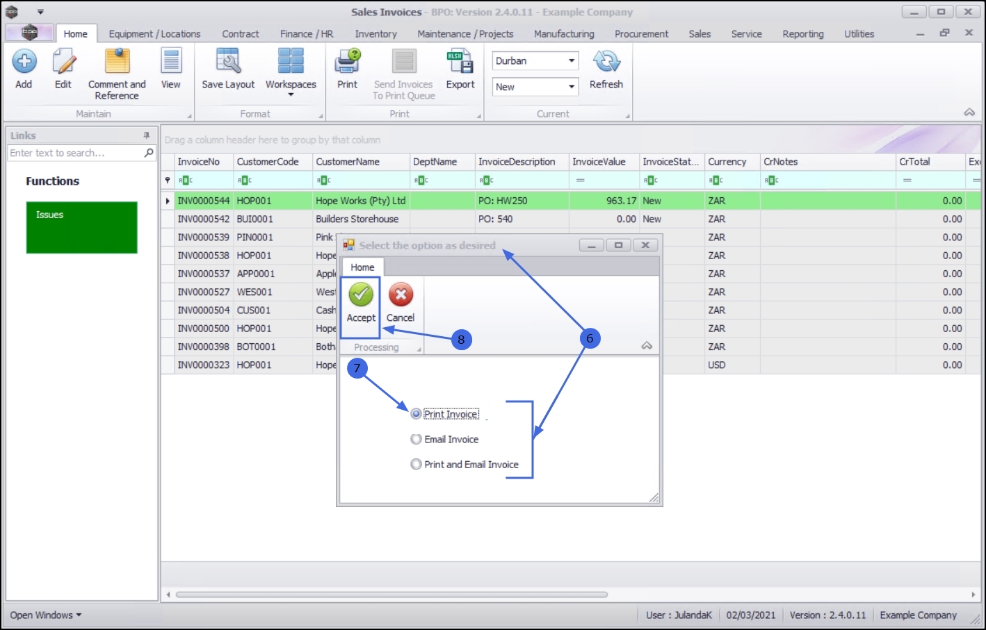• Print Invoice  will open the Invoice in the Report Preview to view, print, export or email.