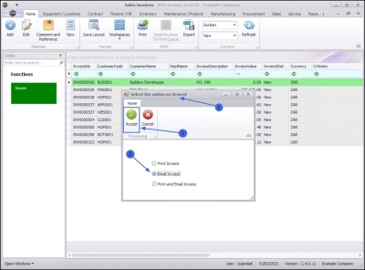 When using the 'Email' option to send a Sales Invoice, note that it will be emailed via the BPO Email Service on the server and not from Microsoft Outlook on your desktop.