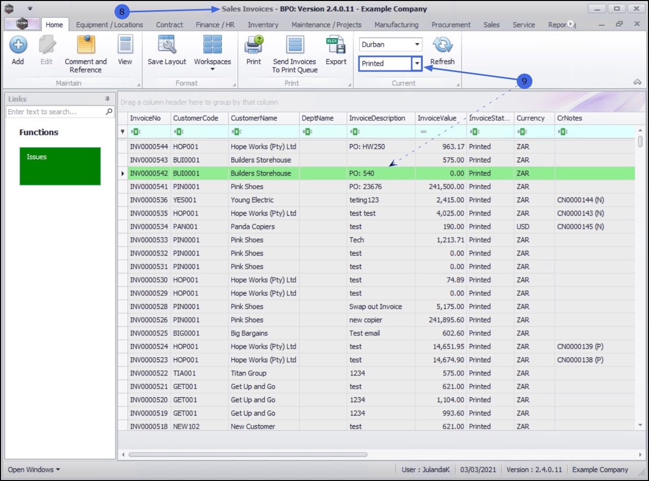 Note that the header reads Tax Invoice. The first time an invoice is printed, it will state: Tax Invoice. Each time thereafter, it will state Copy - Tax Invoice.