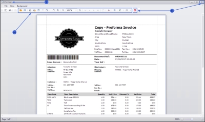 - From the preview screen you can make cosmetic changes to the document, as well as Save, Zoom, Add a Watermark, Export or Email the Proforma Invoice.