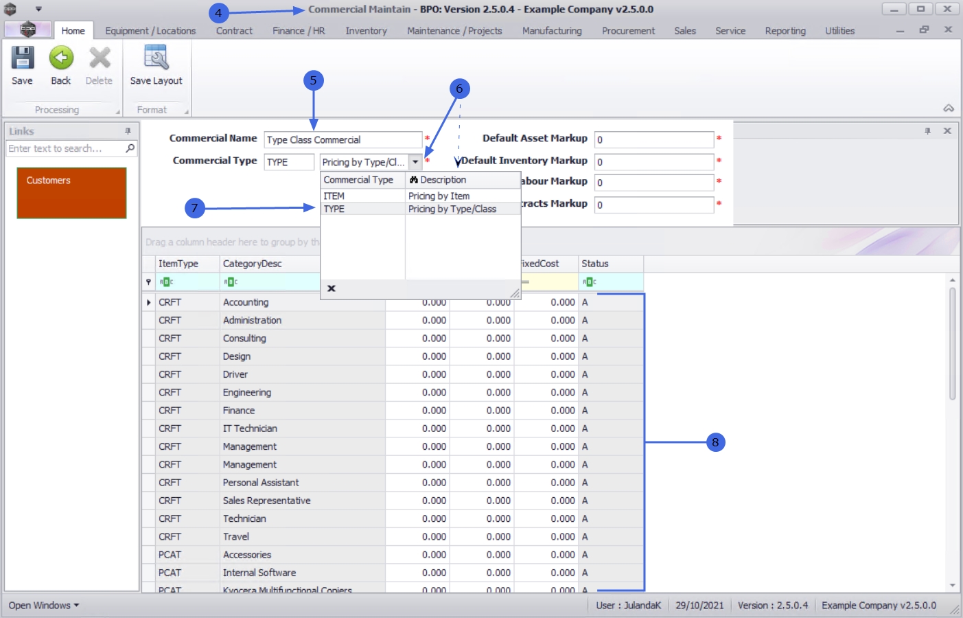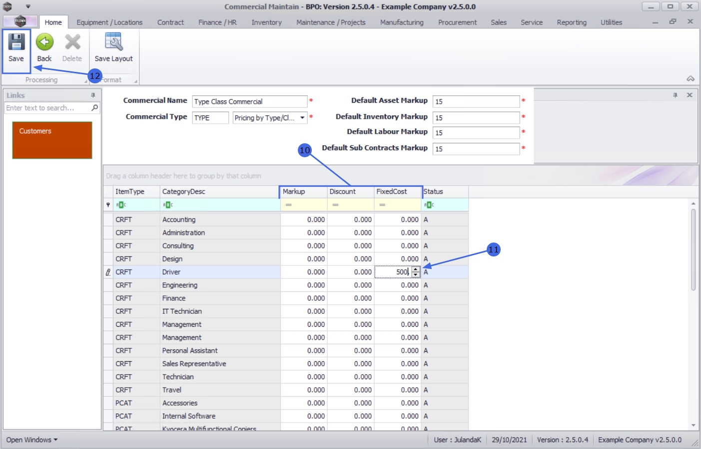The commercial specifics grid displays the Markup, Discount and FixedCost for specific items, e.g. discount on a certain labour type, or a consumable item, etc.