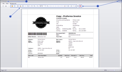 - You can make cosmetic changes to the document from this screen, as well as Save, Print, Add a Watermark, Export or Email the Proforma Invoice.