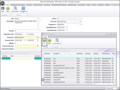 - Click on the row selector in front of the project that you wish to link to this work request.