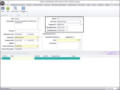 - Assigned To: This will auto populate with the person who is currently logged on to the system. You can click on the drop-down arrow and select from the menu an alternative employee assigned to this work request if required.