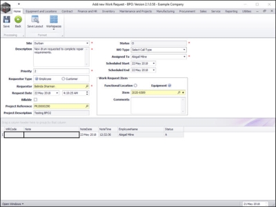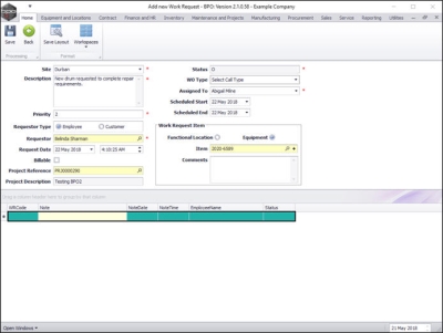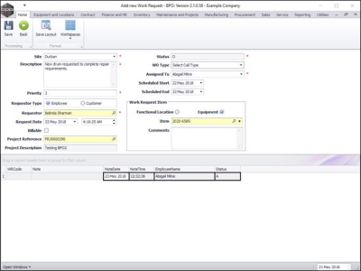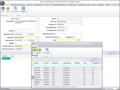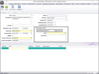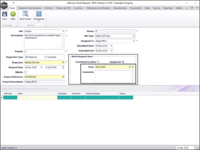 - In this example, a work request for a drum is being created therefore the Equipment radio button has been selected.