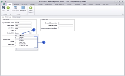 If the company has only one Site (branch) the Default Site field may be set to that singular Site. The user will not need to select a Site when they are working in screens that contain a Site filter.