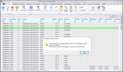 The request item cannot be deleted as there is an existing part issued. Action as required. The transaction ended in the trigger. The batch has been aborted.
