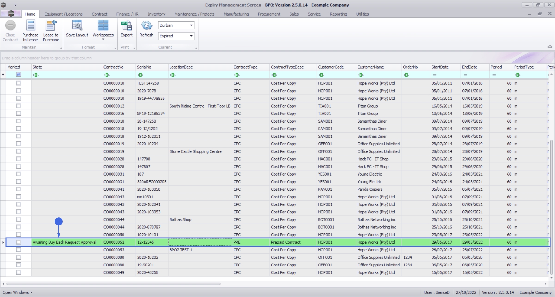 Upon opening, this screen will default to the Expired status, listing all the serial numbers on contracts that have expired, indicating the state of the serial number. The expiry date is based on the contract start date + contract period.