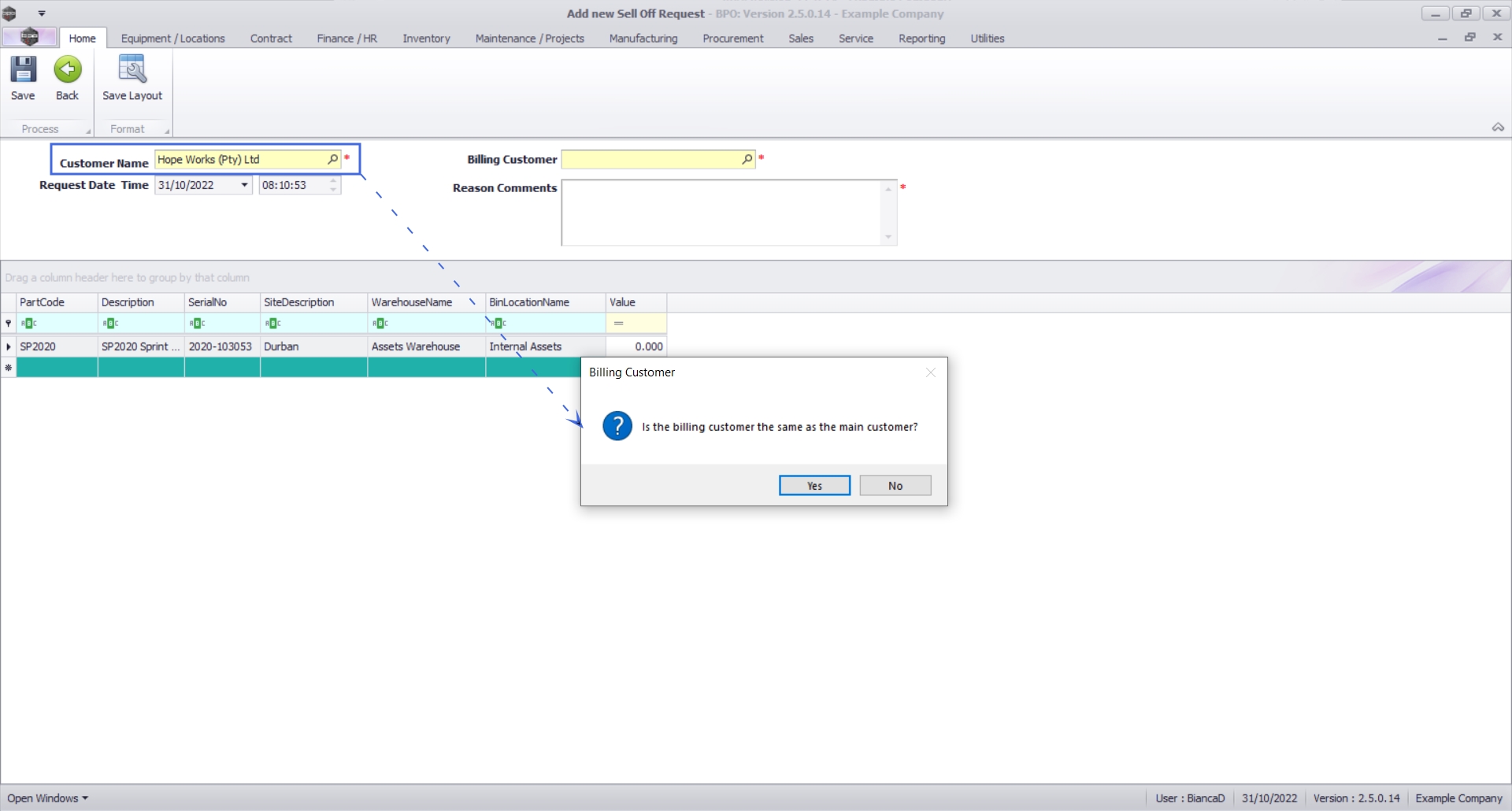 - Click on the Yes button, to auto-populate the Billing Customer field with the same customer selected.