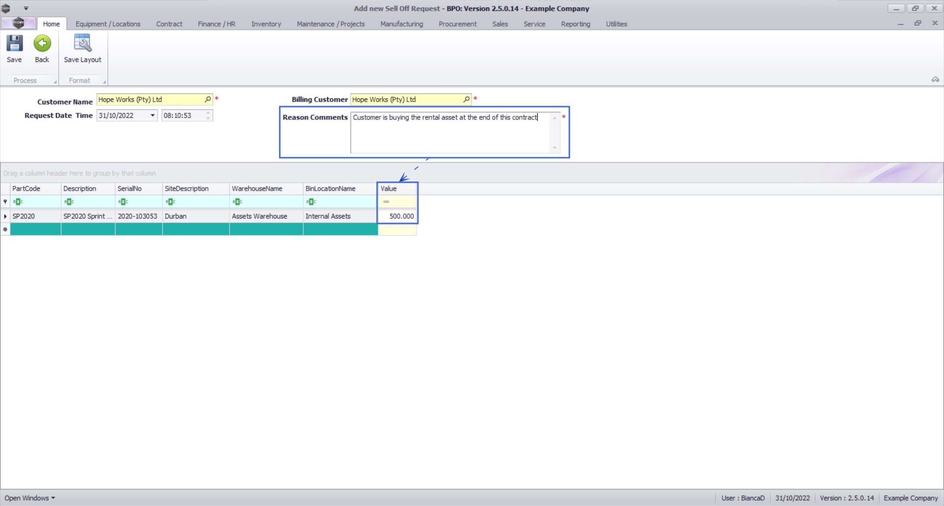 For expired contracts that remain active, you have the ability to sell off serial numbers that have been selected, if the selected items are internal assets.