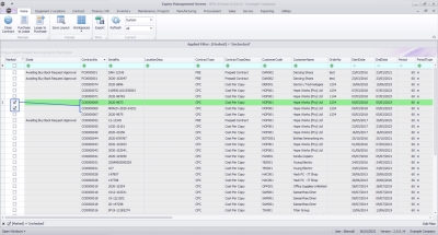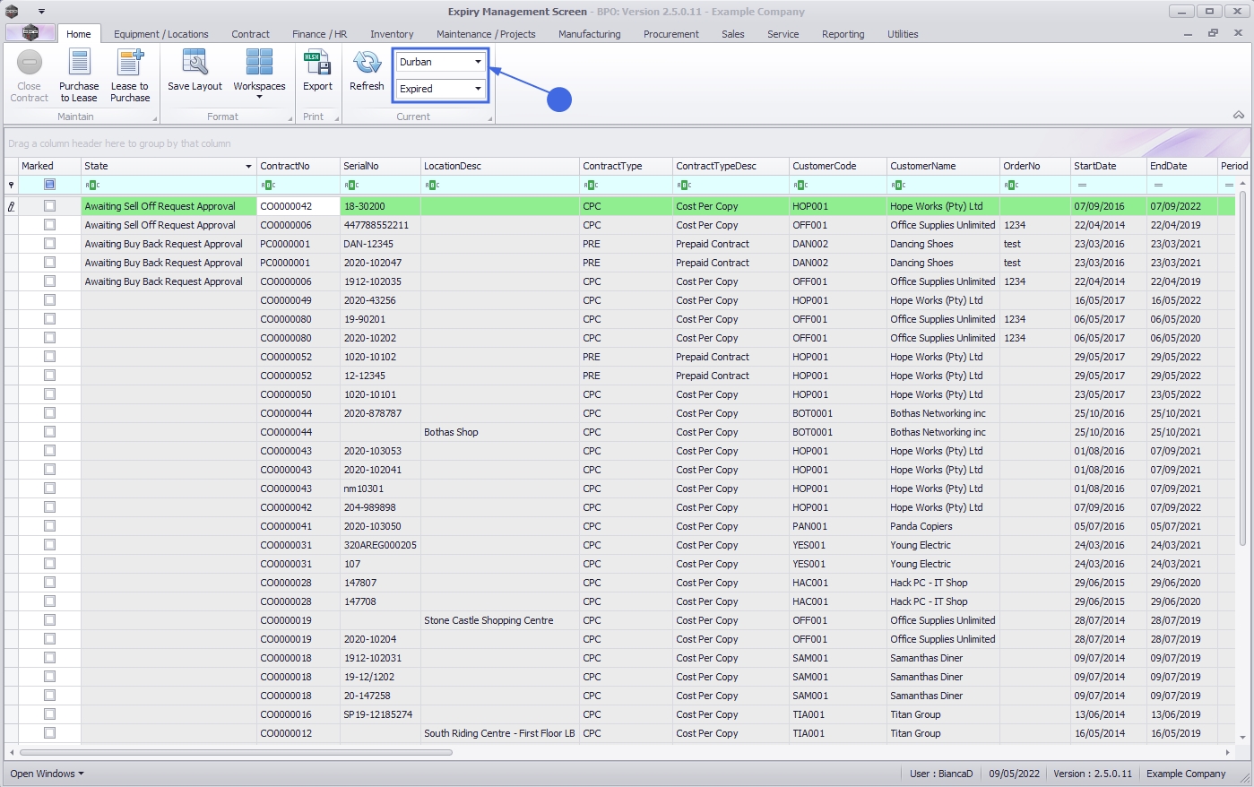 Upon opening, this screen will default to the Expired status, listing all the serial numbers on contracts that have expired, indicating the state of the serial number. The expiry date is based on the contract start date + contract period.