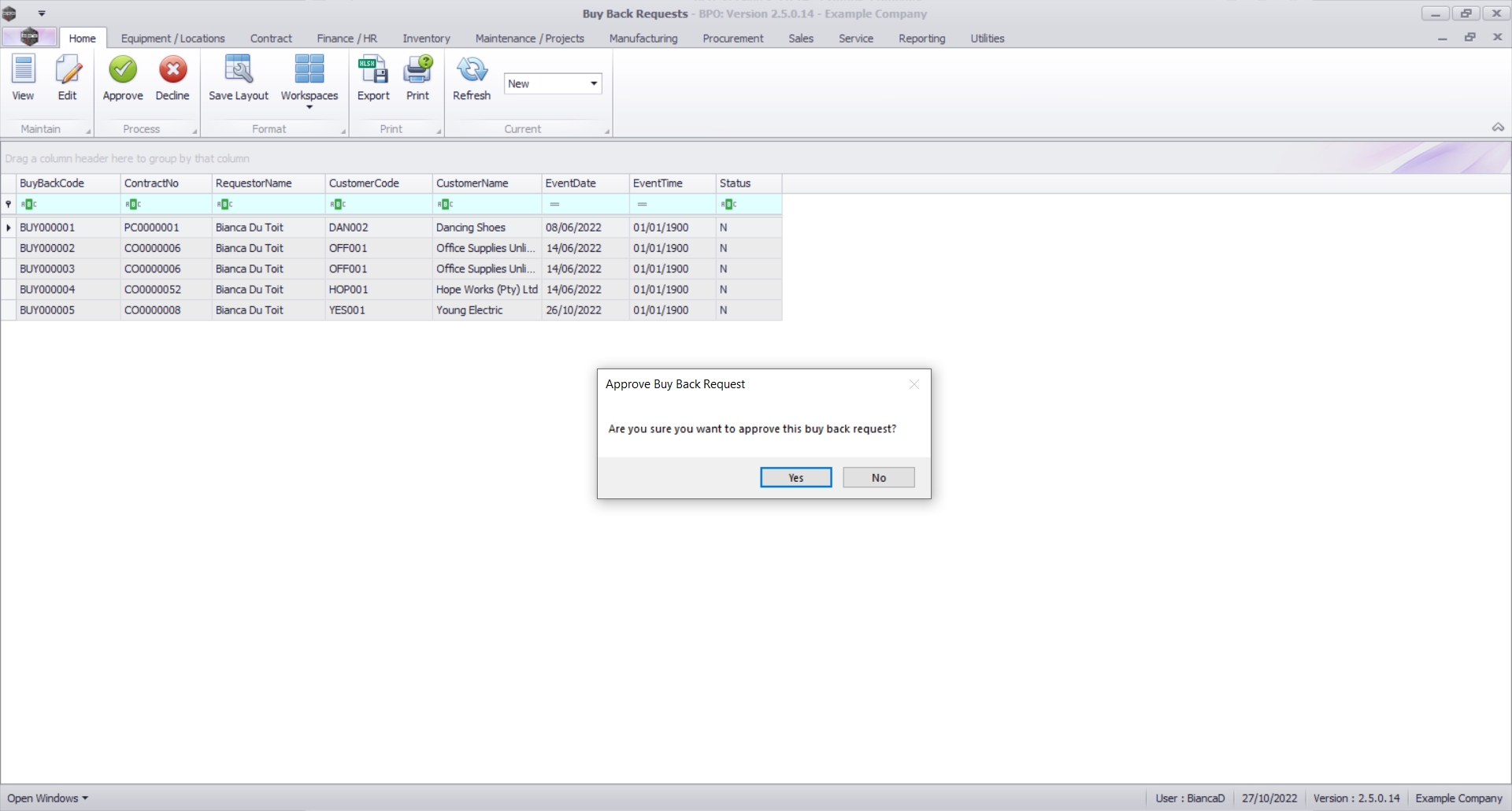 The Approve Buy Back Request message box will come up, asking: Are you sure you want to approve this buy back request?