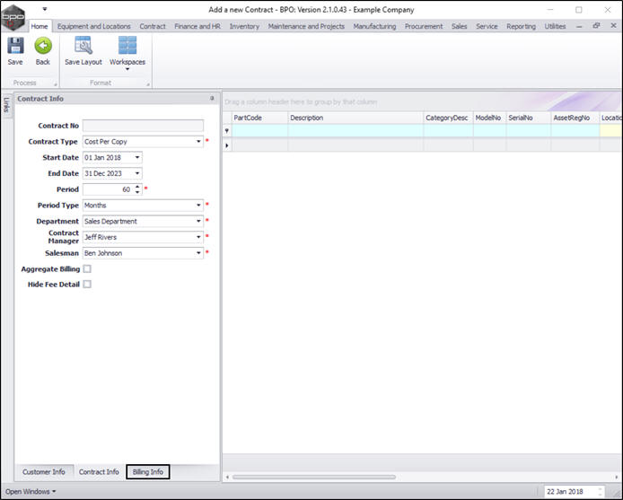 - When you have finished editing the contract info details, click on the Billing Info tab.