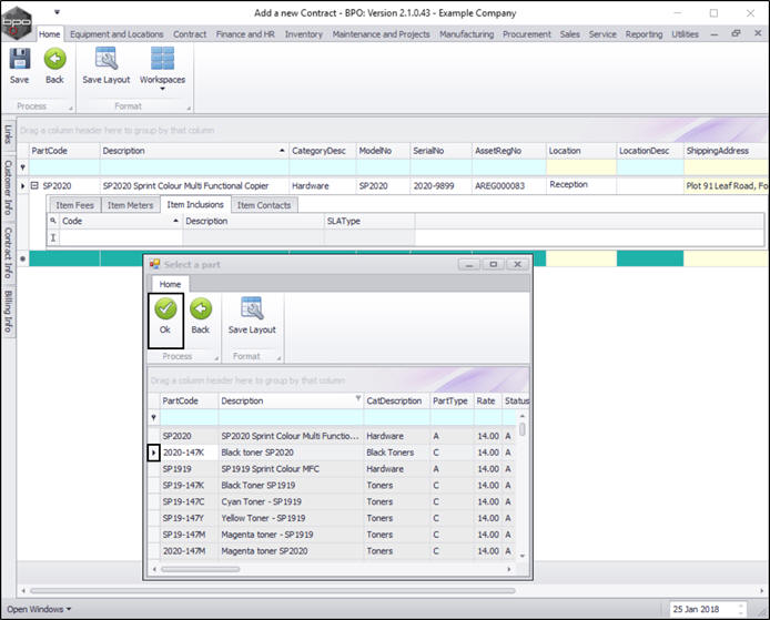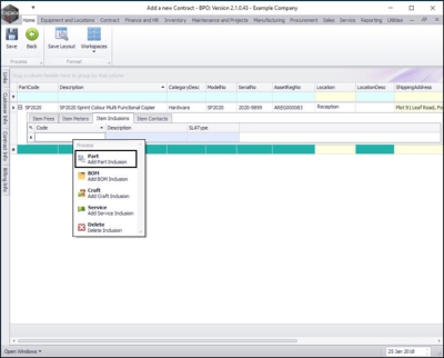 - Click on the row selector in front of the part you wish to add to this contract as an inclusion.