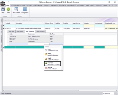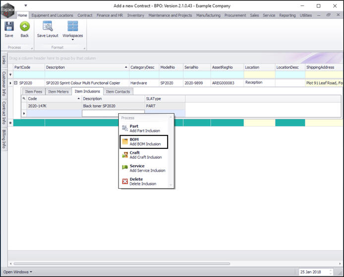 - Click on BOM - Add BOM Inclusion (contract inclusion parts issued to a call that will not be billed).