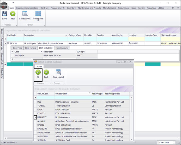 - Click on the row selector in front of the BOM you wish to add to this contract as an inclusion.