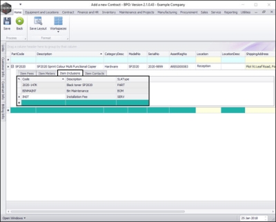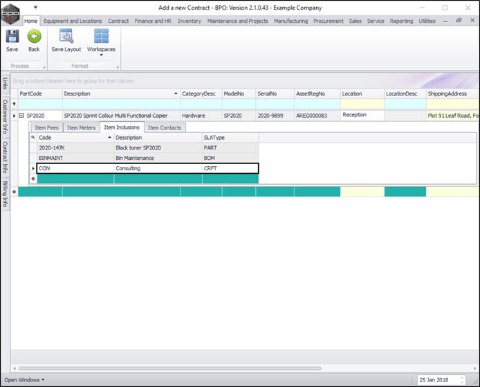 - The Item Inclusions frame lists all Contract Inclusions (items which are included in the contract and not billed separately).