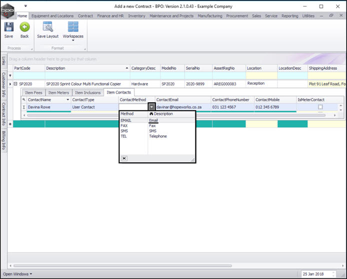 - Click in the Contact Method text box to reveal a drop-down arrow.
