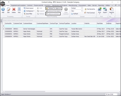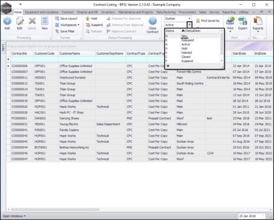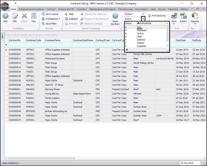 - The new contract will be saved and you will return to the Contract Listing screen where the status defaults to Active.